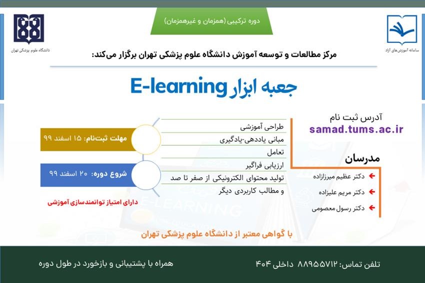مرکز مطالعات و توسعه آموزش علوم پزشکی دانشگاه علوم پزشکی تهران دوره آموزشی کشوری جعبه ابزار E-larning را در اسفند 1399 و فروردین 1400 به صورت مجازی (غیر همزمان و همزمان) برگزار می نماید.