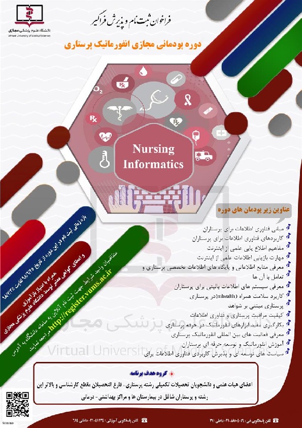 دانشگاه علوم پزشکی مجازی در راستای بهره مندی از بستر فضای مجازی در جهت ارتقای عدالت آموزشی در کشور و با عنایت به سرعت چشمگیر رشد و توسعه بکارگیری روشهای انفورماتیک پرستاری در جهان و توجه به آن در شرح وظایف پرستاران و شاخص های اعتبار سنجی بیمارستان ها، اقدام به طراحی دوره پودمانی " انفورماتیک پرستاری " نموده است.