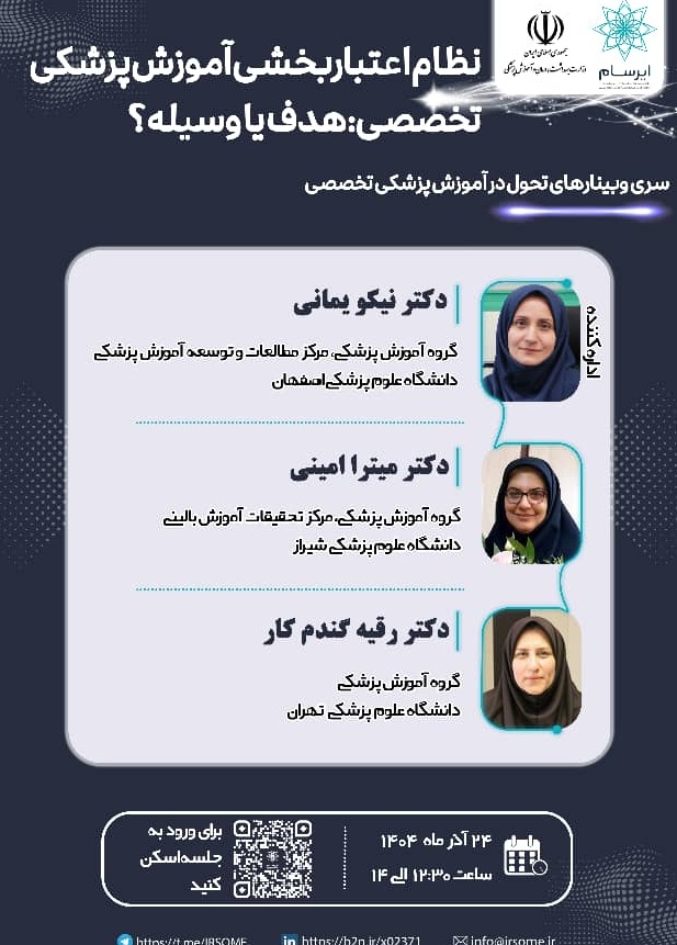 دبیرخانه شورای آموزش پزشکی و تخصصی با همکاری انجمن علمی متخصصان علوم پزشکی ایران(ایرسام)، چهارمین وبینار از سلسله وبینارهای تحول در آموزش پزشکی تخصصی را در روز پنجشنبه مورخ 1404/09/24 از ساعت 12:30 الی 14 برگزار می نماید.لینک ورود به جلسه: