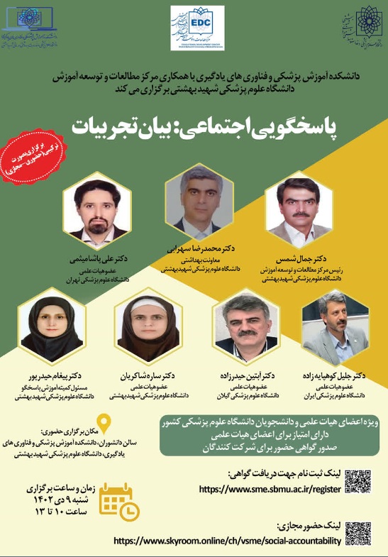 رویداد پاسخگویی اجتماعی : بیان تجربیات، در تاریخ 9 دی ماه و بصورت ترکیبی توسط مرکز مطالعات و توسعه آموزش علوم پزشکی و دانشکده آموزش پزشکی و فناوری های یادگیری دانشگاه علوم پزشکی شهید بهشتی برگزار می شود.
