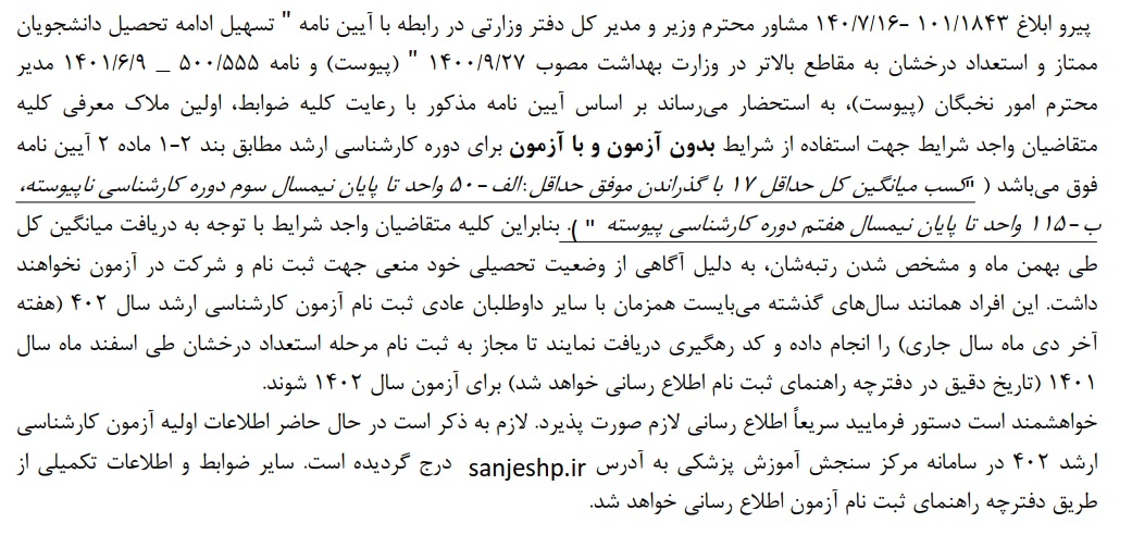 شرایط جدید معرفی کلیه متقاضیان واجد شرایط تسهیلات ادامه تحصیل دانشجویان ممتاز و استعداد درخشان درخصوص شرط داشتن معدل و همچنین لغو 2 سال سابقه کار بالینی اعلام گردید.
